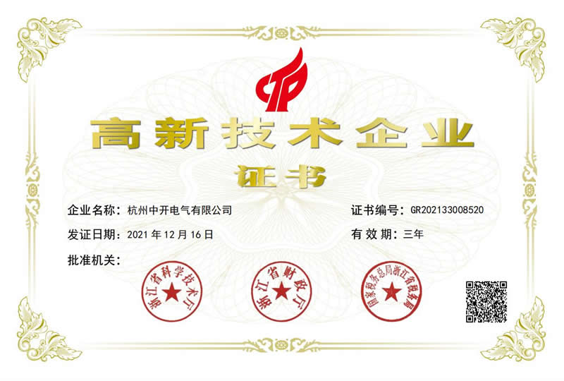 近日,經(jīng)有關(guān)部門組織專家評審、公示等程序后,杭州中開電氣有限公司成功通過國家級高新技術(shù)企業(yè)認(rèn)定。